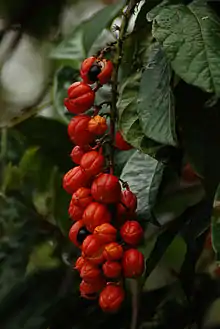 Guarana (/ɡwəˈrɑːnə/ from the Portuguese guaraná [ɡwaɾɐˈna]), Paullinia cupana, syns. P. crysan, P. sorbilis) is a climbing plant in the family Sapindaceae, native to the Amazon basin and especially common in Brazil. Guarana has large leaves and clusters of flowers and is best known for the seeds from its fruit, which are about the size of a coffee bean.