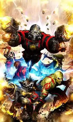 ![]() Promotional image for Guardians of the Galaxy (vol. 2) #1 (May 2008) Art by Clint Langley depicting Star-Lord, Rocket Raccoon, Drax the Destroyer, Gamora, Quasar and Phyla-Vell. | |