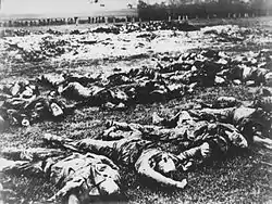 The prisoners reached the field just after sunset and were ordered to line up in ranks and make a left face; the guards then raised their rifles and opened fire. Some executioners hesitated before firing, conscious that their friends and neighbours were about to be killed, and many of the victims were initially struck in the legs. Some of the wounded cursed the Ustaše and others cried in agony. Kvaternik observed the massacre from a distance of about 50 metres (160 ft), accompanied by Hans, Verhas and Pavlešić. Pavlešić was dissatisfied with the speed of the killings and shouted at Čikoš, telling him to "finish the job".[37] Čikoš's men then went about looking for survivors and bayonetting anyone that moved.[30] Five prisoners escaped before Čikoš's men could kill them and fled to a nearby forest.[37]