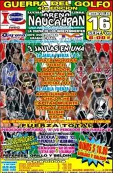 Starting as far back as at least 2000, the Mexican wrestling promotion International Wrestling Revolution Group (IWRG; Sometimes referred to as Grupo Internacional Revolución in Spanish) has held several annual events where the main event was a multi-man steel cage match where the last wrestler left in the cage would be forced to either remove their wrestling mask or have their hair shaved off under Lucha de Apuestas, or "bet match", rules. From 2005 IWRG has promoted a spring time show promoting the steel cage match concept under the name Guerra del Golfo, or "Gulf War", referring to the Gulf of Mexico, not the Gulf War in the middle east. The Gurerra del Golfo shows featured two "qualifying" steel cage matches where the loser would later be forced to face off against each other in the main event of the show, a final cage match where the loser would be forced to either unmask or have his/her hair shaved off. The use of the steel cage in three matches distinguishes the Guerra del Golfo event from other Steel cage matches held throughout the year such as the IWRG El Castillo del Terror ("The Tower of Terror"), IWRG Guerra de Sexos ("War of the Sexes") or IWRG Prison Fatal ("Deadly Prison") shows. The Guerra del Golfo shows, as well as the majority of the IWRG shows in general, are held in "Arena Naucalpan", owned by the promoters of IWRG and their main arena. The September 2009 Guerra del Golfo show was the third year IWRG promoted a show under that name and the second year in a row since becoming an annual event from 2008 forward. 2009 was the only year to date where IWRG held two Guerra del Golfo shows in a year, having previously held a Guerro del Golfo show in January 2009.