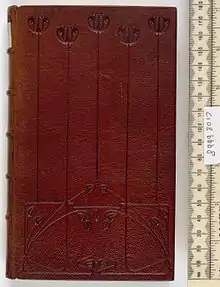 Members and associates of the Guild of Women Binders carved out a niche for themselves at the end of the 19th century by producing fine, artistic bindings by hand in an era when bookbinding was becoming increasingly mechanized. As part of its training efforts, the Guild set up a workshop, headed by Karslake's daughter Constance, near the Hampstead Bindery in 1899.[5] The Guild accepted for training only women with an art school background, likely limiting them to a small pool of middle-class women; by 1903, they had an estimated 25-30 students.[6] In keeping with the artistic styles of the time, many of the bindings featured Art Nouveau patterns, with sweeping lines and elegantly curved shapes. Karslake's advertising claimed that each binding was decorated with a unique pattern, though several patterns seem to have been variations of others.[7]