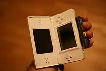 Guitar Hero: On Tour was released on the Nintendo DS hand-held system on June 22, 2008. The game includes a peripheral, dubbed the "Guitar Grip", a rectangular device that fits into the second slot of the Nintendo DS or DS Lite. The peripheral only features the first four fret buttons and a strap so the Nintendo DS can be held sideways comfortably for play. The game also includes a guitar pick shaped stylus for use with strumming in the game, which players move across the touchscreen.[72] Guitar Hero: On Tour was developed by Vicarious Visions, who also ported the Guitar Hero games to Nintendo's Wii console.