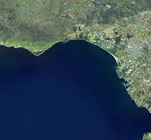 The Gulf of Cadiz is located in the north-eastern Atlantic Ocean between 34°N and 37°15′N and 6°W to 9°45′W.[1] It is enclosed by the southern Iberian and northern Moroccan margins, west of Strait of Gibraltar.[1]