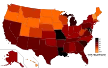 In a 2015 study conducted by the Law Center to Prevent Gun Violence, state gun laws were examined based on various policy approaches, and were scored on grade-based and ranked scales.[114] States were rated positively for having passed stricter measures and stronger gun laws. Positive points were also given for states that required background checks on all sales of firearms and that limited bulk firearms purchases, and that prohibited sales of assault weapons and large-capacity magazines, and that carried out stricter evaluations of applications for handgun concealed-carry licenses, especially in the context of prohibited domestic-violence offenders. Meanwhile, points were deducted from states with laws that expanded access to guns, or that allowed concealed carry in public areas (particularly schools and bars) without a permit, or that passed "Stand Your Ground Laws" — which remove the duty to retreat and instead allow people to shoot potential assailants. Eventually, states were graded indicating the overall strengths or weakness of their gun laws. The ten states with the strongest gun laws ranked from strongest starting with California, then New Jersey, Massachusetts, Connecticut, Hawaii, New York, Maryland, Illinois, Rhode Island and finally Michigan. The states with weakest gun laws were ranked as follows: South Dakota, Arizona, Mississippi, Vermont, Louisiana, Montana, Wyoming, Kentucky, Kansas, and Oklahoma. A comparable study of state laws was also conducted in 2016.[115] Based on these findings, The Law Center concluded that comprehensive gun laws reduce gun violence deaths, whereas weaker guns laws increase gun-related deaths. Furthermore, among different kinds of legislation, universal background checks were the most effective at reducing gun-related deaths.[116]