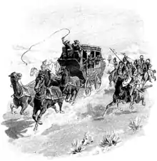 In Western movies, the characters' gun belts are often worn low on the hip and outer thigh, with the holster cut away around the pistol's trigger and grip for a smooth, fast draw. This type of holster is a Hollywood anachronism.[15] Fast-draw artists can be distinguished from other movie cowboys because their guns will often be tied to their thigh. Long before holsters were steel-lined, they were soft and supple for comfortable all-day wear. A gunfighter would use tie-downs to keep his pistol from catching on the holster while drawing. Most of the time, gunfighters would just hide their pistols in their pockets and waistbands.[9] Wild Bill Hickok popularized the butt-forward holster type, which worked better on horseback.[15] Other gunfighters would use bridgeport rigs that gave a faster and easier draw.[16] Revolvers were a popular weapon to gunfighters who were horsemen, cowboys, and lawmen because of their concealability and effectiveness on horseback.[1] The Winchester rifle was also a popular weapon among gunfighters. Dubbed the "Gun that Won the West", it was widely used during the settlement of the American frontier. Shotguns were also a popular weapon for "express messengers" and guards, especially those on stagecoaches and trains who were in charge of overseeing and guarding a valuable private shipment.