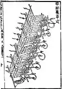 In Zhao Shizhen's book of 1598 AD, the Shenqipu, there were illustrations of Ottoman Turkish musketmen with detailed illustrations of their muskets, alongside European musketeers with detailed illustrations of their muskets.[56] There was also illustration and description of how the Chinese had adopted the Ottoman kneeling position in firing while using European-made muskets,[57] though Zhao Shizhen described the Turkish muskets as being superior to the European muskets.[58] The Wubei Zhi (1621) later described Turkish muskets that used a rack-and-pinion mechanism, which was not known to have been used in any European or Chinese firearms at the time.[59]