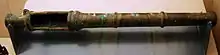 The middle Ming period saw the arrival of European guns in China. As early as 1518 Portuguese breech-loading swivel gun known as folangji could be purchased in the Ming dynasty.[45] In 1523 a test batch of 32 were produced for the court and in 1528 4,000 were produced for border fortifications.[46] Views diverge on whether the origin of the cannon is Portuguese or Turkish. There was a confusion whether folangji was supposed to be the name of a people (the Portuguese) or name of a weapon. In fact the word folangji represent 2 different words with different etymology. The term folangji as a weapon is related to the prangi carried in Ottoman galleys and farangi used by Babur. The word folangji as an ethnonim (Frankish or Portuguese) is unrelated.[47]:143 The Ottoman prangi guns may have reached Indian ocean before either Ottoman or Portuguese ships did.[47]:242 In the History of the reign of Wan Li (萬厲野獲編), by Shen Defu, it is said that "After the reign of Hong Zhi (1445-1505), China started having Fu-Lang-Ji cannons, the country of which was called in the old times Sam Fu Qi". In volume 30 about "The Red-Haired Foreigners" he wrote "After the reign of Zhengtong (1436-1449) China got hold of Fu-Lang-Ji cannons, the most important magic instrument of foreign people". He mentioned the cannons some 60 or 70 years prior to the first reference about Portuguese. It was impossible for the Chinese to get hold of the Portuguese cannons prior to their arrival.[48] Pelliot viewed that the folangji gun reached China before Portuguese did.[49] Needham noted that breech-loading guns were already familiar in Southern China in 1510, as a rebellion in Huang Kuan was destroyed by more than 100 folangji.[50]:372