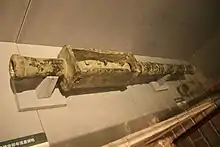Most early Ming guns weighed only two to three kilograms while guns considered "large" at the time weighed around only 75 kilograms. During Siege of Suzhou in 1366 the Ming army fielded "large" cannons weighing up to 80 kilograms, which were about a meter in length, and had a muzzle diameter of about 21 centimeters.[13] A gun known as the "Great Bowl-Mouth Tube" (大碗口筒) dated to 1372 weighs only 15.75 kilograms and was 36.5 centimeters long, its muzzle 11 centimeters in diameter. Other excavated guns of this type range from 8.35 to 26.5 kilograms. They were usually mounted on ships or gates as defensive weapons. Accuracy was low and they were limited to a range of only 50 paces or so.[14]