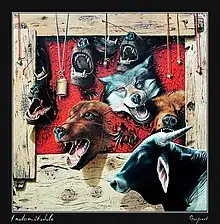 In his career Gurpreet Singh has painted hundreds of paintings where his main focus is on Sikh History. He has done several series such as on bulls or on meditation. Gurpreet Singh, has been awarded the state award for painting by the Punjab Lalit Kala Akademi.[1] He was given Professional Category’s Award for his paintind "Indomitable".[2] He said “In this painting I have shown a bull symbolising an honest and strong common man. He cannot be dominated by evil forces of society. Some barking and howling wild animals are shown at the back as a symbol of evil forces. And old wooden frame depicts the orthodox social structure,” he said.