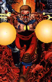 Guy would join up with the Doc Savage analogue[25] Buck Wargo and his globe-trotting Monster Hunters, which featured obscure Silver Age hero Tiger-Man (Desmond Farr) along with Joey Hong and Rita Muldoon. On an expedition to the Amazon, Gardner found and drank from the chalice of the Warrior Water. This activated alien DNA that had been implanted in his bloodline a millennium ago by a space-traveling race called the Vuldarians. He discovered new, shapeshifting abilities that writer Beau Smith claims were editorially mandated to capitalize on the success of Mighty Morphin Power Rangers,[26] and which would allow him to resume his role as a superhero. When Guy first emerged, his body had assumed the shape of his old exosuit, albeit red instead of gold, and his lost eye had been restored. Guy's body remained that way until the end of the Zero Hour storyline, morphing weapons directly out of his arms as of Zero Hour issue #2.