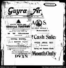 The Guyra Argus was first published in 1902 by Albert Michael Roche and was published under this title until 1957.[2] The newspaper reappeared under various other names, including the Guyra Guardian from 1959 to 1983,[3] when it was bought by Rural Press Ltd and incorporated into the Tablelands Times. A local community newspaper, called the Guyra Shire Chronicle, followed from 1983 to 1988.[4][5] After this closed, a series of community meetings were held to determine the future of the newspaper and Geoffrey and Margaret Hovey, who had previously owned The Tenterfield Star were asked to launch a newspaper; they began publishing the Guyra Weekly News in 1989 and it remained in publication until 1992.[6][5] Publication recommenced under the Guyra Argus masthead in 1993.[7]