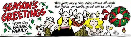 Hägar the Horrible is the title and main character of an American comic strip created by cartoonist Dik Browne, and syndicated by King Features Syndicate. It first appeared in February 1973, and was an immediate success.[1] Since Browne's retirement in 1988 (and subsequent death), his son Chris Browne has continued the strip.[2] As of 2010, Hägar is distributed to 1,900 newspapers in 56 countries and translated into 12 languages.[3] The strip is a caricature commenting on modern-day life in the United States through a loose interpretation of Viking Age Scandinavian life.