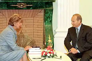 Carrère d'Encausse was a member of the European Parliament between 1994 and 1999, representing the right-wing Conservative party RPR.[1] She was awarded the Lomonosov Gold Medal and Grand Cross with Star of the Order of Merit of the Republic of Poland in 2008 and 2011, respectively. She is a cousin of Salome Zourabichvili, the current President of Georgia.