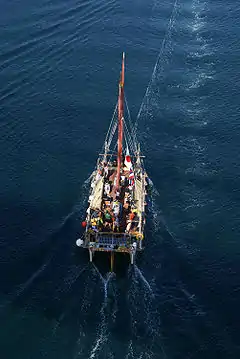Hōkūleʻa[2][3] is a performance-accurate waʻa kaulua,[4][5] a Polynesian double-hulled voyaging canoe.[6][7] Launched on 8 March 1975[8] by the Polynesian Voyaging Society, she is best known for her 1976 Hawaiʻi to Tahiti voyage completed with exclusively Polynesian navigation techniques[10] The primary goal of the voyage was to explore the anthropological theory of the Asiatic origin of native Oceanic people (Oceania maps: detail, region), of Polynesians and Hawaiians in particular, as the result of purposeful trips through the Pacific, as opposed to passive drifting on currents, or sailing from the Americas.[11][12] (DNA analysis illuminates this theory.[13]) A secondary project goal was to have the canoe and voyage "serve as vehicles for the cultural revitalization of Hawaiians and other Polynesians".[14]