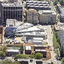 In 2014, the Arlington School Board identified a need for additional middle school capacity in the north-central area of the county. After contentious public debate over various options, it was determined that the Stratford building was the best location for a new middle school, and another location would be chosen for H-B Woodlawn. On December 18, 2014 the School Board voted to construct a new building for H-B Woodlawn in the Rosslyn neighborhood of Arlington, Virginia, on property that was formerly home to Wilson School and Rosslyn Highlands Park.[7] The Wilson School was demolished in 2017, and construction began on the new building at 1601 Wilson Blvd. (See side panel for full address). The new building was mostly completed and ready for use in late summer 2019. It featured 7 levels (basement, ground, 1–5), of which the basement and ground floors are underground, with the rest in a fanning shape above ground.[8] Schooling began in the new building in the 2019–2020 school year, starting September 3, 2019, with some students happy about the change and others not.[9][10] The building was completed at a cost of $100 million.[11][12][13]