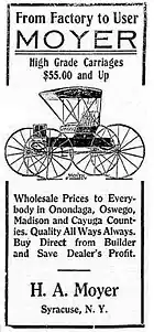 H. A. Moyer Automobile Company (1908–1915), a manufacturer of luxury automobiles in Syracuse, New York, was founded by Harvey A. Moyer (1853–1935) of Clay, New York.[1] The company began business in 1876 in Cicero, New York, as H. A. Moyer Carriage Company. As the era of the horse-drawn carriage came to an end, Moyer switched assembly to motor vehicles, although he still produced carriages for some time after that.