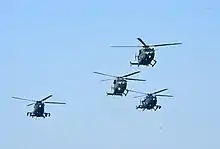 Deliveries of the Dhruv commenced in January 2002, nine years after the prototype's first flight, and nearly eighteen years after the program was initiated.[10] The Indian Coast Guard was the first service to operate the Dhruv; this was followed by the Indian Army, Indian Navy, Indian Air Force and the Border Security Force. 75 Dhruvs were delivered to the Indian armed forces by 2007, and as of 2008 it was planned to produce 40 helicopters annually.[38] The Indian Air Force's Sarang aerobatic display team performs using 4 Dhruv helicopters.[39] In 2007, a further order for 166 helicopters was placed by the Indian Army.[40][41] India may order up to 12 Dhruvs outfitted with an onboard emergency medical suite, to be used by the Armed Forces Medical Services for MEDEVAC purposes.[42]