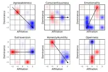 The dimensions of the HEXACO model of personality has been visualised in two dimensions using the Atlas of Personality, Emotion and Behaviour.[35] The adjectives used to describe each HEXACO dimension are scored using the atlas' two orthogonal dimensions of affiliation and dominance. The scored points are then visualised using kernel density plots in two dimensions. The vectors drawn on each of the six plots is a representation of the HEXACO dimension expressed in the two dimensions of the atlas.