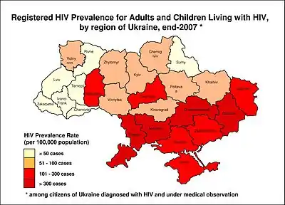 UNAIDS estimates that the number of people infected with HIV/AIDS in 2003 was 360,000 (range 180,000 to 590,000), representing an adult prevalence of 1.4%. According to the Ministry of Health—which estimates that by 2002 there were more than 500,000 people infected or nearly 2% of the adult population—the epidemic has now spread to every oblast in the country. Prevalence in the southern and eastern oblasts (Odessa, Mykolaiv, Dnipropetrovsk, and Donetsk) is about three times higher than rates in the rest of the country.[16] A major reason for this is the fact that the urbanized and industrialized regions in the East and South of Ukraine suffered most from the economic crisis in the 90s, which in turn led to the spread of unemployment, alcoholism, and drug abuse, thus setting the conditions for wider spread of the epidemic.[17]