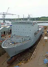 Largs Bay and sister ship Lyme Bay were ordered from Swan Hunter on 18 December 2000.[1] Largs Bay was laid down at Swan Hunter's shipyard at Wallsend, Tyne and Wear on 28 January 2002; the first ship of the class work started on.[1] The ship was launched on 18 July 2003.[1] The ship was completed and accepted by the Ministry of Defence in April 2006, over a year late.[10] Largs Bay was dedicated on 28 November 2006, the second of the class to enter service with the RFA.[1] The Bay-class construction project saw major delays and cost overruns, particularly in the Swan Hunter half of the project.[10] Shortly after Largs Bay was handed over, Swan Hunter was stripped from the project, with BAE taking full responsibility for the class and Lyme Bay towed to BAE's shipyard in Govan for completion in June 2006.[10]