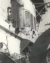 During the evening of 16–17 June, the three destroyers were ordered to undertake surveillance missions around Tiger Island, because of reports of North Vietnamese helicopter activity in the area.[44] At 03:09, Hobart's radar picked up an aircraft approaching with no IFF transponder active.[45] At 03:14, the aircraft fired a single missile at the ship, which killed one sailor, wounded two others, and damaged the chief petty officer's mess, air search radar and missile control compartments, and the ship's funnels.[46] Two minutes later, the aircraft made a second pass and fired two missiles.[47] The missiles hit simultaneously: one penetrated the superstructure and damaged the gunners' store, engineers workshop, and aft seamans' mess, while the other hit close to the original missile, causing further damage to the mess and missile control room, while also damaging the Tartar checkout room, killing another sailor, and wounded six others.[48] There was also major damage around the destroyer's Ikara magazine, but as Hobart was not carrying any Ikara missiles at the time, the potential magazine fire did not occur.[49] The aircraft came around for a third attack run, but was scared off when Hobart's forward gun turret, under independent control, fired five rounds at the aircraft.[50][51] At 03:30, Edson reported coming under fire, and Hobart's captain ordered the three destroyers to take up anti-aircraft formation.[51] At 05:15, the three destroyers linked up with the cruiser USS Boston (which had been hit by a missile from another aircraft) and the escorting destroyer USS Blandy, and continued anti-aircraft manoeuvring.[50] After being relieved, Hobart sailed for Subic Bay, where the damage was inspected by RAN and USN personnel, including three admirals.[50] Debris collected from Hobart and the other ships indicated that the missiles were of United States Air Force (USAF) origin.[52]