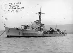 In 1946 Childers was assigned to the 1st Destroyer Squadron based at Malta. She saw service, along with other Royal Navy ships in preventing illegal immigration into Palestine in 1947.[6] Her pennant number was also later changed to D90 from R91. She returned to the UK in 1950 and was placed in reserve in 1951. She was given an interim modernization in 1954, which saw her 'X' turret at the rear of the ship replaced by two Squid anti-submarine mortars.[7]