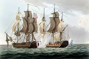 The next year, on 19 August 1797, Dryad captured the French privateer Éclair.[10] Éclair was armed with ten 4-pounder and four 8-pounder guns. She had a crew of 108 men and had sailed from L'Orient on 11 August, and had not taken anything.