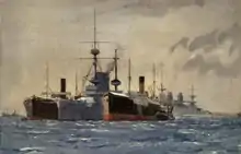 HMS Exmouth was laid down by Laird Brothers at Birkenhead on 10 August 1899. She was floated out on 31 August 1901, when she was named by Lady Alice Stanley, wife of Lord Stanley, Financial Secretary to the War Office, who afterwards gave a speech.[4] She arrived at the Nore in May 1902, and was armed and completed for sea at Chatham Dockyard.[5] After delays due to labour problems, she was completed in May 1903. Exmouth commissioned at Chatham Dockyard on 2 June 1903 for service in the Mediterranean Fleet. She returned to the United Kingdom in May 1904, and on 18 May 1904 recommissioned as Flagship, Vice Admiral, Home Fleet, serving as flagship of Sir Arthur Wilson. When the Home Fleet was redesignated as the Channel Fleet, she continued to serve as the fleet flagship. She transferred her flag in April 1907,[6] was reduced to a nucleus crew,[7] and entered the commissioned reserve to begin a refit at Portsmouth Dockyard.[6]