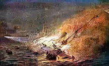International law allowed the German ship a stay of 24 hours before she would have to leave or be interned; her captain claimed that his engines were disabled which extended the deadline to eight days. In the meantime, Kent had summoned Glasgow and the two ships entered Cumberland Bay in the island on the morning of 14 March and found Dresden at anchor. The German ship trained her guns on the British ships and Glasgow opened fire, Luce justifying his action by deeming it an unfriendly act by an interned ship that had frequently violated Chilean neutrality. Dresden hoisted a white flag four minutes later as she was already on fire and holed at her waterline. A boat brought Lieutenant Wilhelm Canaris to Glasgow to complain that his ship was under Chilean protection. Luce told him that the question of neutrality could be settled by diplomats and that he would destroy the German ship unless she surrendered. By the time that Canaris returned to Dresden, her crew had finished preparations for scuttling and abandoned ship after opening her Kingston valves. It took 20 minutes before the cruiser capsized to port and sank. The British shells had killed one midshipman and eight sailors and wounded three officers and twelve ratings.[26] After the sinking, a sailor from Glasgow noticed a pig swimming in the water and, after nearly being drowned by the frightened pig, succeeded in rescuing him. The crew named him 'Tirpitz', and he served as the ship's mascot for a year and was then transferred to Whale Island Gunnery School, Portsmouth, for the rest of his life.[27]