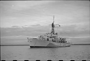 The corvettes were armed with one QF 4-inch Mk XIX gun mounted forward.[2][note 4] Anti-air armament varied from 4 to 10[2] Oerlikon 20 mm cannons.[5] For ASW purposes, the ships were equipped with one three-barreled Squid anti-submarine mortar with 81 projectiles. The ships also had two depth charge throwers and one depth charge rail on the stern that came with 15 depth charges.[4]