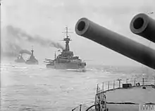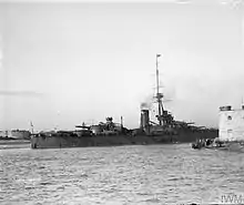 In 1914 the shelter-deck guns were enclosed in casemates[5] and a fire-control director was installed sometime in 1914, before August, on a platform below the spotting top.[6] By October 1914, a pair of 3-inch (76 mm) anti-aircraft (AA) guns had been installed. Additional deck armour was added after the Battle of Jutland in May 1916. Around the same time, three 4-inch guns were removed from the aft superstructure and the ship was modified to operate kite balloons. A flying-off platform was mounted on 'B' turret's roof and extended onto the gun barrels during 1917–1918. A high-angle rangefinder was fitted in the forward superstructure by 1921.[7]