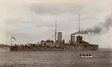 The gun turrets had nine-inch fronts and sides, while their roofs were 2.5 to 3.25 inches (64 to 83 mm) thick. The barbettes were protected by nine inches of armour above the deck, but it thinned to 8 inches (203 mm) above the upper armour deck and 3 inches (76 mm) below it. The forward 4-inch guns were protected by three-inch sides and a two-inch high-tensile steel deck overhead. The conning tower sides were 10 inches (254 mm) thick, with three-inch roofs and communication tubes. Her aft torpedo director tower was protected by six-inch walls and a three-inch cast steel roof. High-tensile steel torpedo bulkheads 2.5 inches (64 mm) thick were fitted abreast the magazines and shell rooms. Her funnel uptakes were protected by high-tensile steel splinter armour 1.5 inches (38 mm) thick on the sides and one inch thick on the ends between the upper and forecastle decks.[25]