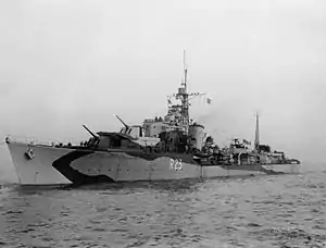 In May 1945, following a refit in January and February, she was assigned to Task Force 57 and then Task Force 37 in the Pacific and was responsible for providing an escort screen to the large Royal Navy carriers used in raids on the Japanese Home Islands.