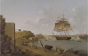 In June 1810 command of the ship passed from Captain Maling to Captain George Charles Mackenzie.[2] On 30 August 1810 she sailed with a convoy for Malta.[6] Under Captain Mackenzie her career appears to have been less eventful, but on 17 February 1811 Undaunted did recapture the transport ship Dorothy[7] just before command passed to Captain Richard Thomas. Under Captain Thomas, Undaunted was sent to the Mediterranean, where she was first employed in co-operating with Spanish guerillas on the coast of Catalonia, and later at the blockade of Marseille, and was for a time the flagship of the small squadron blockading Toulon.[8] On 29 April 1812 the boats of Undaunted, the frigate Volontaire, and the sloop Blossom attacked a convoy of 26 French vessels near the mouth of the river Rhone. Led by Lieutenant Eagar of Undaunted, they captured seven vessels, burned twelve, and left two grounded on the beach. A French Navy schooner armed with four 18-pounders and a crew of 74 was among the vessels burnt. The attack was carried out without loss, being protected by Captain Stewart in Blossom.[9] Captain Thomas was eventually invalided home,[8] and command of Undaunted passed to Captain Thomas Ussher on 2 February 1813.[10]