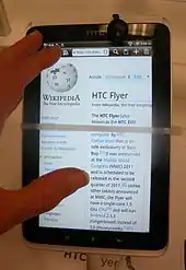 The HTC Flyer (also known as the HTC EVO View 4G) is a tablet computer by HTC Corporation. It was announced at the Mobile World Congress (MWC) 2011 and released in May 2011.[4] Unlike other tablets announced at MWC, the Flyer has a single-core 1.5 GHz CPU[5] and ran 2.3.3 (Gingerbread).[2][3] In February 2011 it was reported that HTC had claimed via Facebook that "Flyer will be getting a Honeycomb upgrade in Q2", however an HTC representative subsequently stated "I can confirm that we are working to bring a Honeycomb update to Flyer in short order – however, I don't have any specific information on what the timing may be."[6] The version running Android 3.2.1 (Honeycomb) was released later in 2011. The HTC Flyer can be updated up to Android Jelly Bean 4.1.1 through the use of custom ROMs.