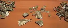 Hacksilver was common among the Norsemen or Vikings, as a result of both their raiding and trade. Hacksilver may also have been used by Romans in their dealings with Pictish tribes.[1] The name of the ruble, the basic unit of modern Russian currency, is derived from the Russian verb рубить ('rubit'), meaning "to chop", from the practice of the Rus, described by Ahmad ibn Fadlan visiting the Volga Vikings in 922. An example of the related Viking weighing scale with weights was found on the Isle of Gigha.[2] Hacksilver may be derived from silver tableware, Roman or Byzantine, church plate and silver objects such as reliquaries or book-covers, and jewellery from a range of areas. Hoards may typically include a mixture of hacksilver, coins, ingots and complete small pieces of jewellery.