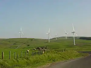 Hadyard Hill Wind Farm is located in Carrick district of South Ayrshire. Costing £85 million, the wind farm consists of 52 three-bladed Siemens wind turbines, each capable of generating 2.3 megawatts (MW) of power, giving a total output of 120 MW. This was Britain's most powerful wind farm when it was commissioned in March 2006.[1]