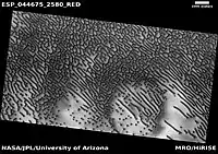 Hagal is the informal name of a dune field on Mars located below the north pole of Mars.[3][4] Its name derives from the sand dunes in Frank Herbert's novel Dune and the fictional planet Hagal.[4] It is located at coordinates 78.0° N latitude, 84.0° E longitude, and consists of linear and round dunes with a southeast slipface orientation.[4] It was one of the dune formations targeted for imaging by the HiRISE camera, on board the Mars Reconnaissance Orbiter, at the rate of one image every six weeks. in the third year (MY31–Mars Year 31)[5] of its seasonal expedition.[4] It is also known as the "Martian Morse Code" due to the linear and rounded formations of its dunes, which have the appearance of dots and dashes.[3][1][6][7]