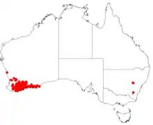 Hakea corymbosa is native to the Great Southern, southern Wheatbelt and Goldfields-Esperance regions of Western Australia from Williams in the west, Albany in the south to Kondinin in the north and Cape Arid in the east. It is found in acid to slightly alkaline, sandy soils over or around laterite or granite, in heath or woodland.[3][6][12]