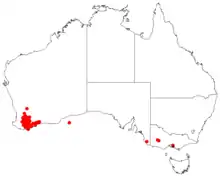 Blue hakea grows from Pingelly ranging south to Albany and east to Ravensthorpe. Grows in heath or shrubland on gravelly-loam, sand or sand over laterite in sun or semi-shade. An adaptable species frost and drought tolerant and may be used as a ground cover and wildlife habitat.[3]