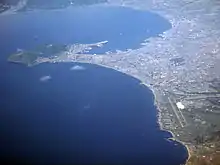 Mount Hakodate was originally an island formed by volcanic eruptions millions of years ago.[8] During the course of history a sand bar formed between Mount Hakodate and the peninsula.[8] This unique landform is called tombolo finished forming in circa 1000 BCE.[8] The tombolo connects the former Hakodate island with the main island Hokkaido to the north.[8] The main central area of Hakodate city is located on the sandbar.[8]