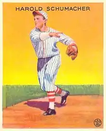 Harold Henry Schumacher (November 23, 1910 – April 21, 1993), nicknamed "Prince Hal", was an American professional baseball player and right-handed pitcher who appeared in 391 games pitched (and 450 games in all) in Major League Baseball for the New York Giants (1931–42; 1946). A native of Hinckley, a village in Trenton, New York, he was listed as 6 feet (1.83 m) tall and 190 pounds (86 kg).