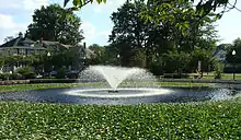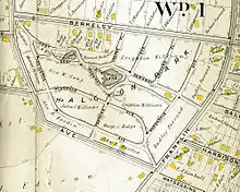 Halcyon Park is an unincorporated community that was developed by Reverend Cyrus Kemper Capron in Bloomfield, in Essex County, New Jersey, United States, in 1895[1] as a planned community of homes with trees and shrubs, picturesque cottages, ponds and common grounds to be maintained by a caretaker and gardener. It is believed that Halcyon Park was inspired by Llewellyn Park,[2] the first planned garden suburb about three miles away. Capron envisioned a private residential park for individuals of moderate means to offer all the advantages of the city (proximity to two railroads and a trolley for access to Newark and New York City, water, gas sewer and paved streets) and the country (trees, ponds, picturesque landscape).[3] The original plan laid out 182 lots and common grounds to include a club house and tennis courts for common use by a lot-owners association.[1] The Club House contained a bowling alley, billiard table, library and stage. The common grounds included a gate house, a conservatory, and two ponds. The land was developed with water, sewer and gas lines and paved streets, innovative at the time.