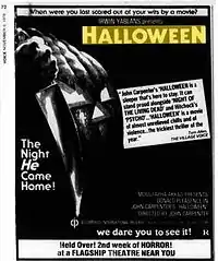 The Los Angeles Times deemed the film a "well-made but empty and morbid thriller,"[83] while Bill von Maurer of The Miami Times felt it was "surprisingly good," noting: "Taken on its own level, Halloween is a terrifying movie—if you are the right age and the right mood."[84] Susan Stark of the Detroit Free Press branded Halloween a burgeoning cult film at the time of its release, describing it as "moody in the extreme" and praising its direction and music.[85] Gene Siskel of the Chicago Tribune gave the film three-and-a-half stars out of four and called it "a beautifully made thriller" that "works because director Carpenter knows how to shock while making us smile. He repeatedly sets up anticipation of a shock and delays the shock for varying lengths of time. The tension is considerable. More than once during the movie I looked around just to make sure that no one weird was sitting behind me."[86] Gary Arnold of The Washington Post was negative, writing "Since there is precious little character or plot development to pass the time between stalking sequences, one tends to wish the killer would get on with it. Presumably, Carpenter imagines he's building up spine-tingling anticipation, but his techniques are so transparent and laborious that the result is attenuation rather than tension."[87] Lou Cedrone of The Baltimore Evening Sun referred to it as "tediously familiar" and whose only notable element is "Jamie Lee Curtis, whose performance as the intended fourth victim, is well above the rest of the film."[88] Tom Allen of The Village Voice praised the film in his November 1978 review, noting it as sociologically irrelevant but ceding its Hitchcock-like technique as effective and "the most honest way to make a good schlock film". Allen pointed out the stylistic similarities to Psycho and George A. Romero's Night of the Living Dead (1968).[71]