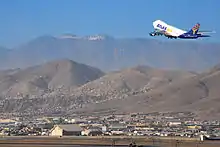Hamid Karzai International Airport (Pashto: د حامد کرزي نړيوال هوايي ډګر; Persian: میدان هوائی بین المللی حامدکرزی; IATA: KBL, ICAO: OAKB) is located 5 kilometers (3.1 mi) from the city center of Kabul in Afghanistan.[5] It serves as one of the nation's main international airports and as one of the largest military bases, capable of housing over one hundred aircraft. It was previously named Kabul International Airport and locally as Khwaja Rawash Airport, though it continues to be officially known by some airlines by the latter name. The airport was given its new name in 2014 in honor of former President Hamid Karzai. The decision was made by the National Assembly of Afghanistan and the Cabinet of President Ashraf Ghani.[6]