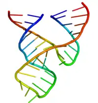 The hammerhead ribozyme is an RNA motif that catalyzes reversible cleavage and ligation reactions at a specific site within an RNA molecule. It is one of several catalytic RNAs (ribozymes) known to occur in nature. It serves as a model system for research on the structure and properties of RNA, and is used for targeted RNA cleavage experiments, some with proposed therapeutic applications. Named for the resemblance of early secondary structure diagrams to a hammerhead shark,[1] hammerhead ribozymes were originally discovered in two classes of plant virus-like RNAs: satellite RNAs and viroids. They have subsequently been found to be widely dispersed within many forms of life.