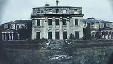 Trinder describes the design as comprising "a large, Palladian central block (corps de logis) accentuated by a giant order of shallow pilasters flanked by low arcaded wings terminated in tetrastyle porticoes, while an asymmetric service wing stretches toward the northeast, hidden behind the bulk of the house."[9] Coadeware plaques of scenes derived from the Borghese Vase adorn both porticos, and the influence of the temples at Paestum (which Latrobe may have witnessed on during prior visit to Naples) and Delos has been noted by scholars.[9][10][11][12] Nikolaus Pevsner also observed that the columns were "patently inspired by the then very recent work of such men as Ledoux and Brongniart".[1]