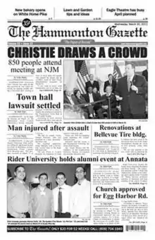 The Hammonton Gazette is a weekly local newspaper located in Hammonton, New Jersey. It was founded in 1997 by the then-23-year-old Gabriel J. Donio. The first print edition was published on July 2, 1997. Gabriel J. Donio is the owner and publisher of The Gazette. Gina L. Rullo is the editor-in-chief. The Gazette staff consists of approximately 30 people. Each Wednesday, the newspaper is distributed throughout Hammonton and the surrounding area. The newspaper primarily covers the town of Hammonton, focusing on local politics, businesses and residents.