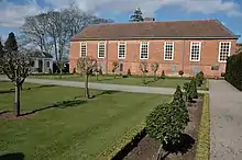 The Orangery is around 120 yards (110 m) to the west of the hall, and was built around 1750. The one-story rectangular building has red Flemish bond ashlar brickwork, with a tiled hip roof behind a parapet. The main elevation faces south, and has nine sets of windows, of which the central three are moved forward and are topped with a pediment, containing a carved fruit basket along with flowers and wreaths. The parapet has urn and pineapple finals. The inside of the building has a tiled floor. The Orangery, along with adjoining walls, were listed on 14 March 1969, and are now Grade II* listed.[6]