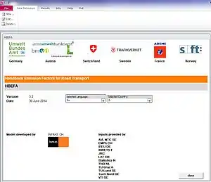 Handbook Emission Factors for Road Transport (HBEFA) is a Microsoft Access database application providing emission factors, i.e. the specific emissions in g/km, for all current road vehicle categories (passenger cars, light duty vehicles, heavy duty vehicles, buses, and motorcycles). Emission factors are provided for all regulated and the most important non-regulated air pollutants as well as for fuel consumption and CO2. HBEFA is used to estimate road transport emissions on different spatial aggregation levels from national to street level.
